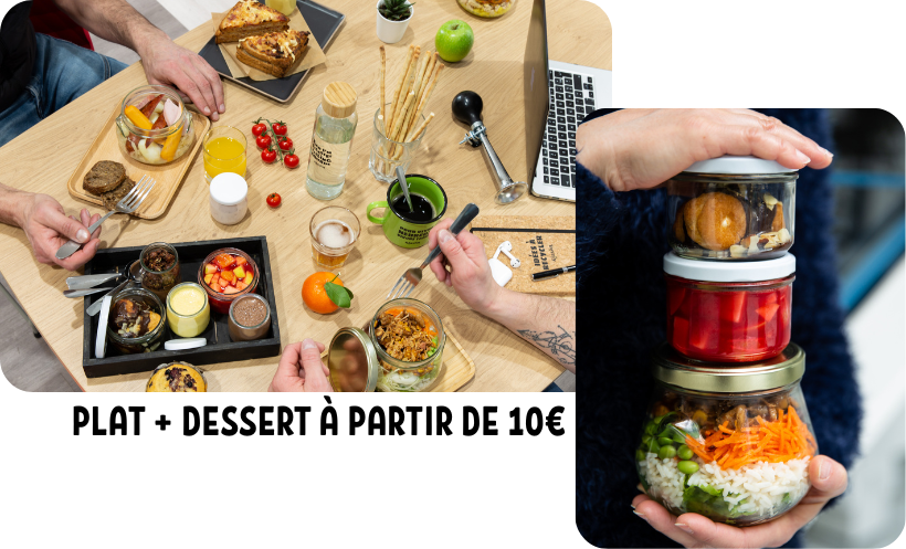 Vos repas du midi faits maison, produits locaux, et Zéro déchet, livrés gratuitement sur votre lieu de travail.
