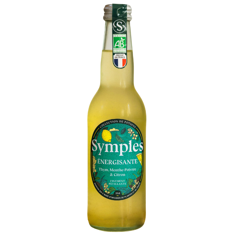 Boisson bio à base d'infusion de plantes et de fruit Infusion de plantes françaises bio (eau finement gazéifiée, romarin*, menthe poivrée*, thym*), sucre de betteraves français*, jus de citron* (2,4%), jus de mirabelle français*, jus d’argousier des Alpes*, caféine naturelle* (150mg/L).