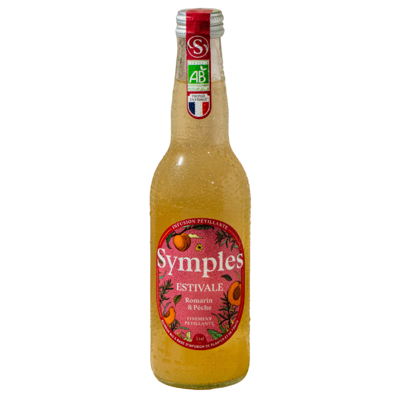 Boisson bio à base d'infusion de plantes et de fruit Infusions de plantes françaises (eau gazéifiée, romarin*, feuilles de clémentine*, verveine*) (86,4%), jus de pêche français* (8,2%), jus de citron*, sucre de betterave français*.