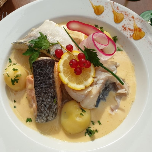 Poisson frais (Saumon, Lieu), Chou, pommes de terre, moules, sauce crème au beurre, (Beurre, fumet de poissons, échalotes, ciboulette, crème fermière de Gaec Beaugendre de Parcé)