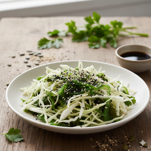 Chou blanc, wakamé, vinaigrette, sauce soja, graine de sésame