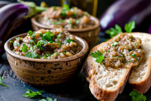 iAubergine, huile d'olive, graine de sésame, coriandre, ail , cha...