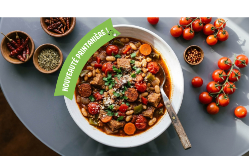Porc, chorizo, épices chili et mexicaine, poivrons, oignons, ail, tomates, carottes, haricot blanc, huile