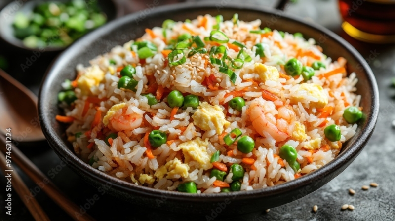 Riz, crevettes, œuf, jambon, petits pois, carottes, oignons, coriandre, sauce soja, graines de sésames