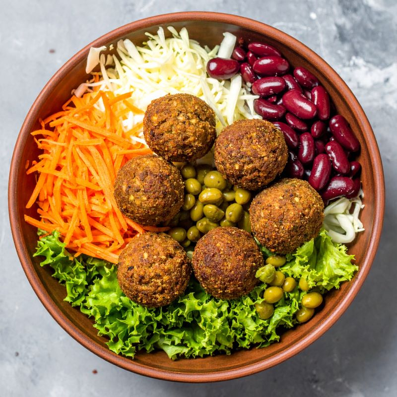 Salade, falafels , carottes râpées, fèves de soja, choux blanc, haricots rouges, oignons frits, sauce vinaigrette thaï