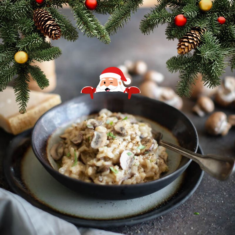 Riz, bouillon de légumes, poireau, celeri, carotte, pleurote, shiitake, champignons de paris, champignons noirs, chanterelle, parmesan, fromage frais salé, crème fermière