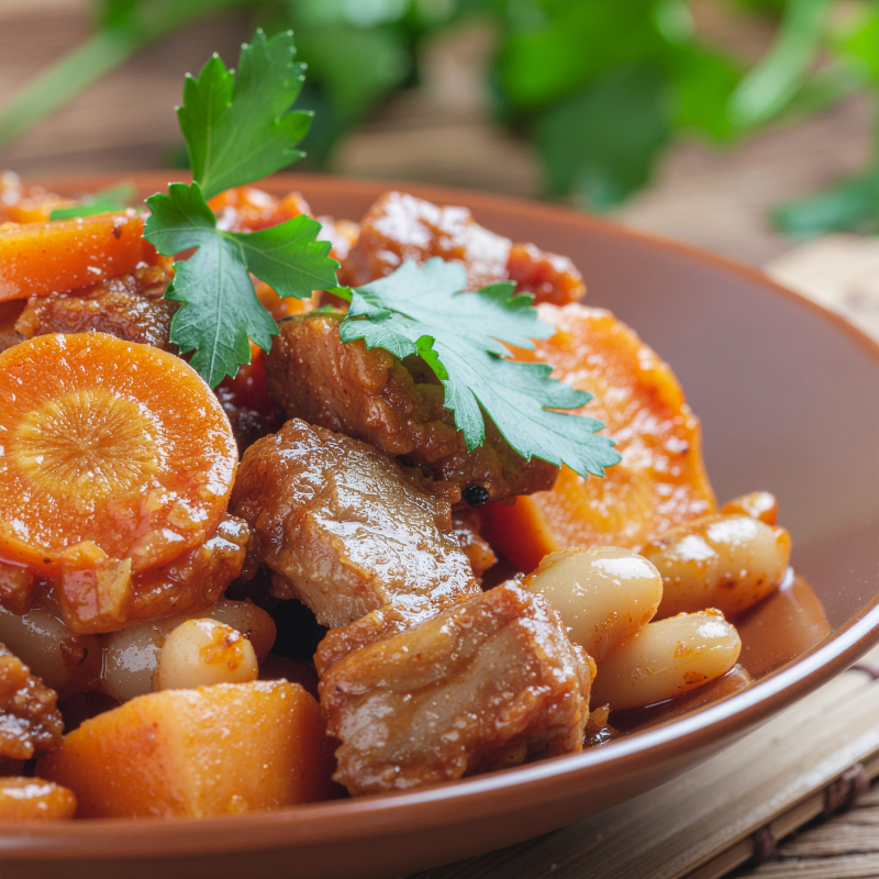 Joue de porc confit, lardons, carottes, flageolets, concentré de tomate, croutons