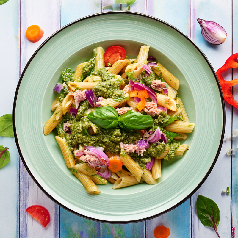 Pâtes, thon, citron, pesto, tomates, concombres, oignons rouges, écorce de citron confit, roquette, huile d'olive, jus de citron, basilic