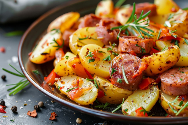 Pomme de terre, saucisson à l'ail, oignons nouveaux, oignons frits, tomates, cornichons, moutarde à l'ancienne, moutarde, vinaigre, huile
