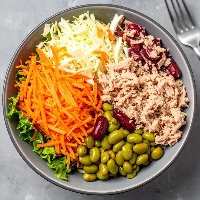 Salade, thon, carottes râpées, fèves de soja, choux blanc, haricots rouges, oignons frits, sauce vinaigrette thaï et sésame