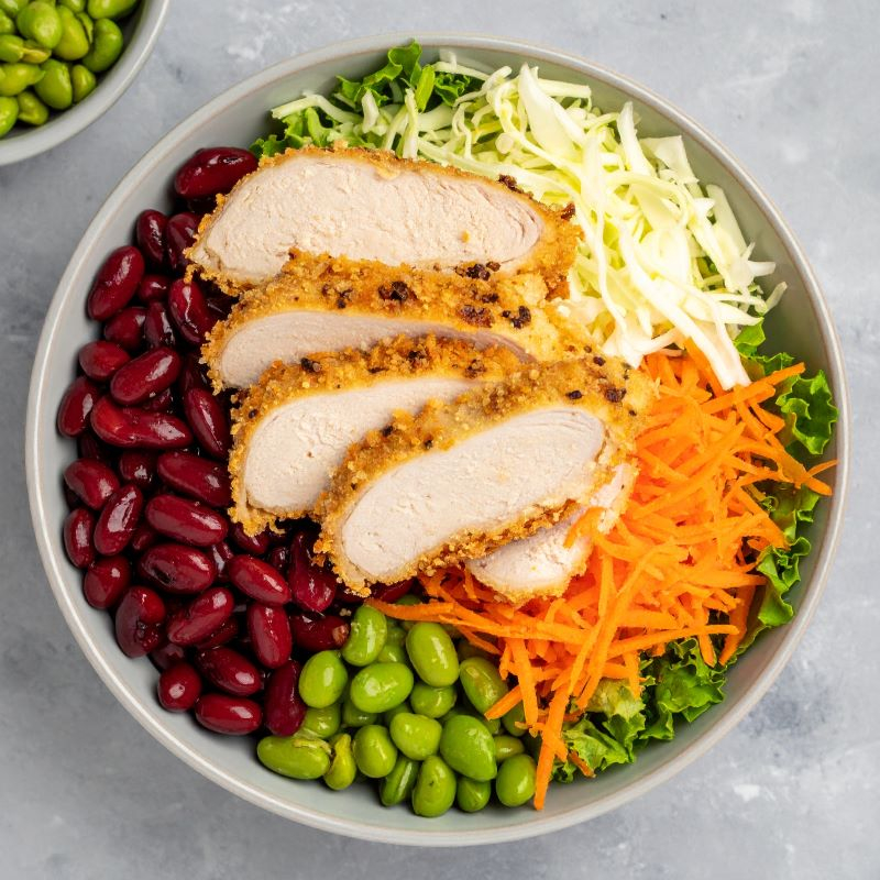 Salade, poulet, carottes râpées, fèves de soja, choux blanc, haricots rouges, oignons frits, sauce vinaigrette thaï