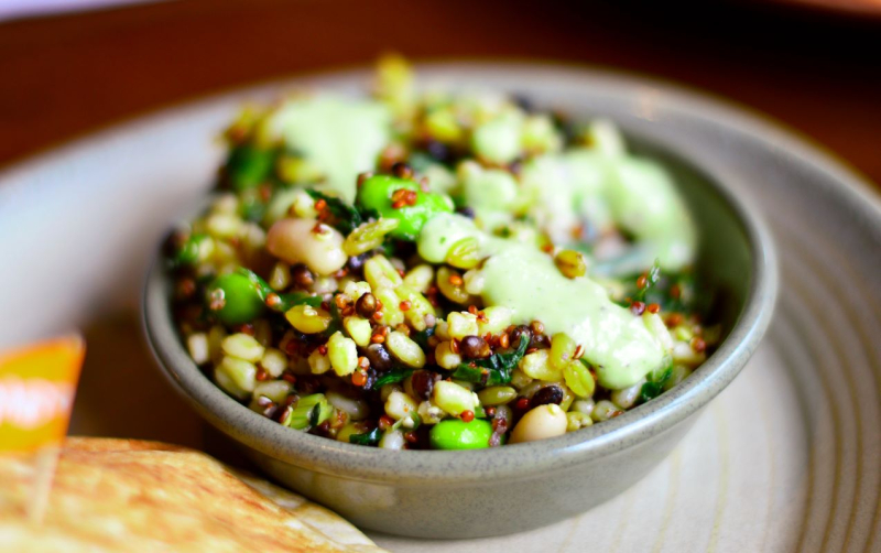 Quinoa, tomate, fève de soja, chou frisé, oignon, épice douce, oignon nouveau, pates, vinaigrette, salade verte