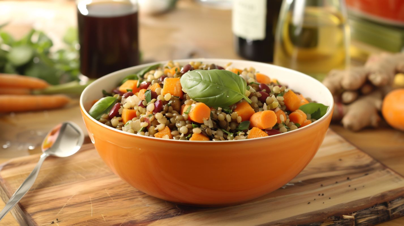 Lentille, riz, carotte, chou-fleur, oignon Cébette, tomate, vinaigrette balsamique, huile d'olive, épices, concombre, maïs, haricots, pois-chiche, jambon italien aux herbes, salade verte