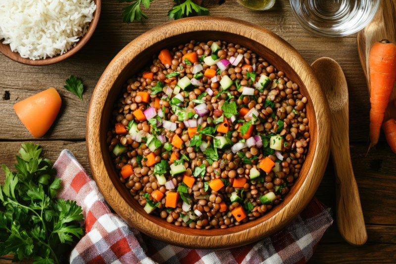 Lentille, riz, carotte, chou-fleur, oignon Cébette, tomate, vinaigrette balsamique, huile d'olive, épices, concombre, maïs, haricots, pois-chiche, thon, salade verte