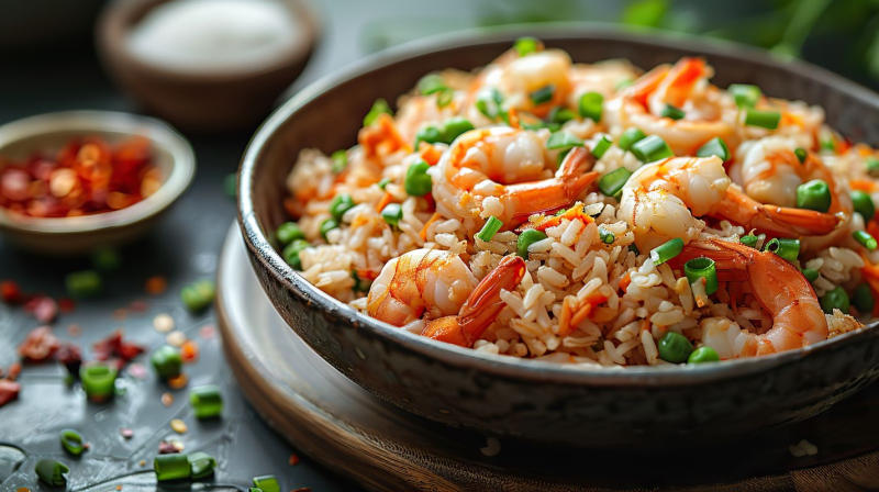 Crevette, thon, riz, petits pois, poivrons rouges, sauce soja, jus de citron, gingembre mariné, salade verte