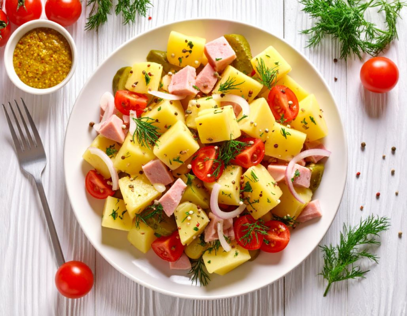 Pomme de terre, pousse d'épinards, oignons nouveaux, oignons frits, jambon italien aux herbes, carottes, tomates, cornichons, persil, moutarde à l'ancienne, mayonnaise